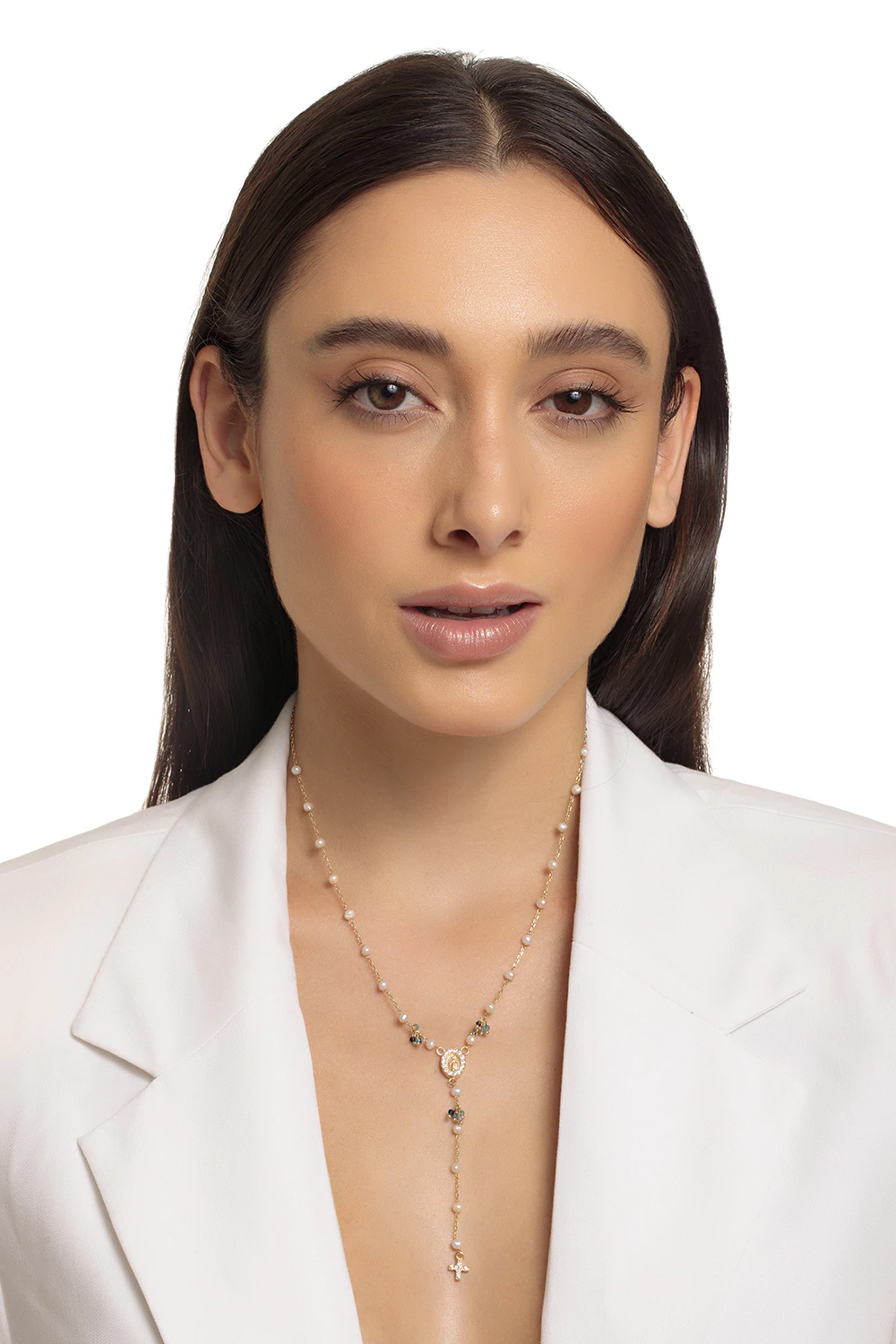 Colar terço com mini pérolas, cristais em tons de azul e pingente de Nossa Senhora cravejado de zircônias. Este acessório combina a tradição espiritual com um toque moderno e elegante. As pérolas e cristais conferem delicadeza e brilho, enquanto o pingente simboliza fé e proteção. Perfeito para looks sofisticados.